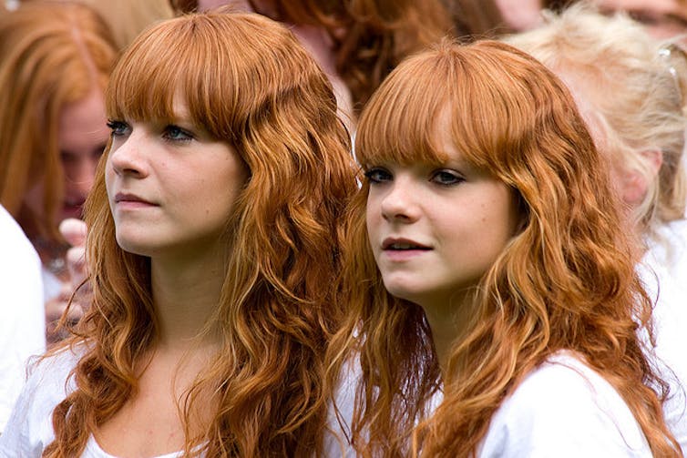 Hair colour depends on the presence and ratios of two groups of melanins: eumelanins (brown and black pigments) and pheomelanins (red and yellow pigments). While variations in the ratio of these pigments can produce an large number of colours and tones, siblings often have strikingly similar hair colour.