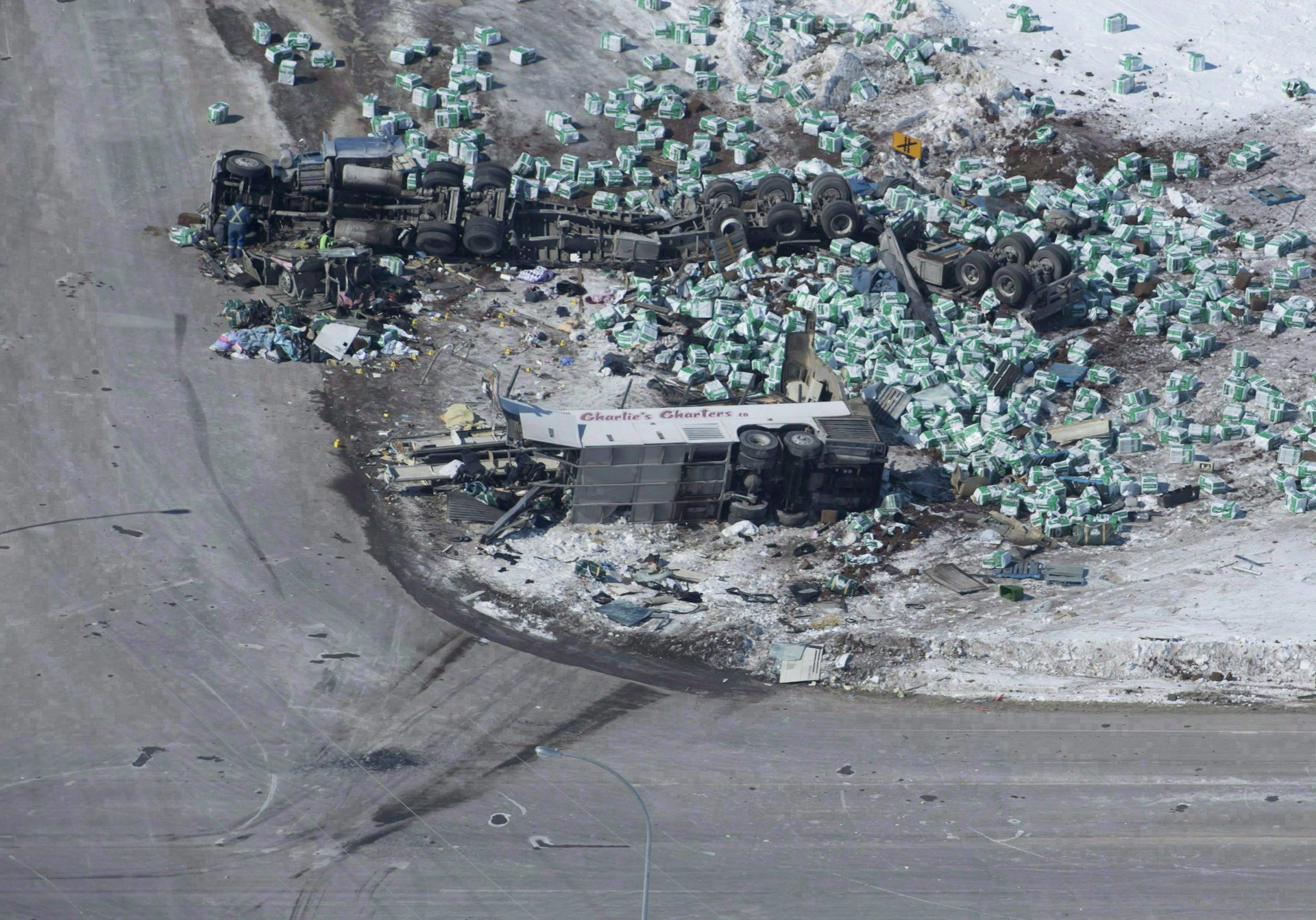 The wreckage of the fatal Humboldt Broncos bus crash outside of Tisdale, Sask., is seen on April, 7, 2018.