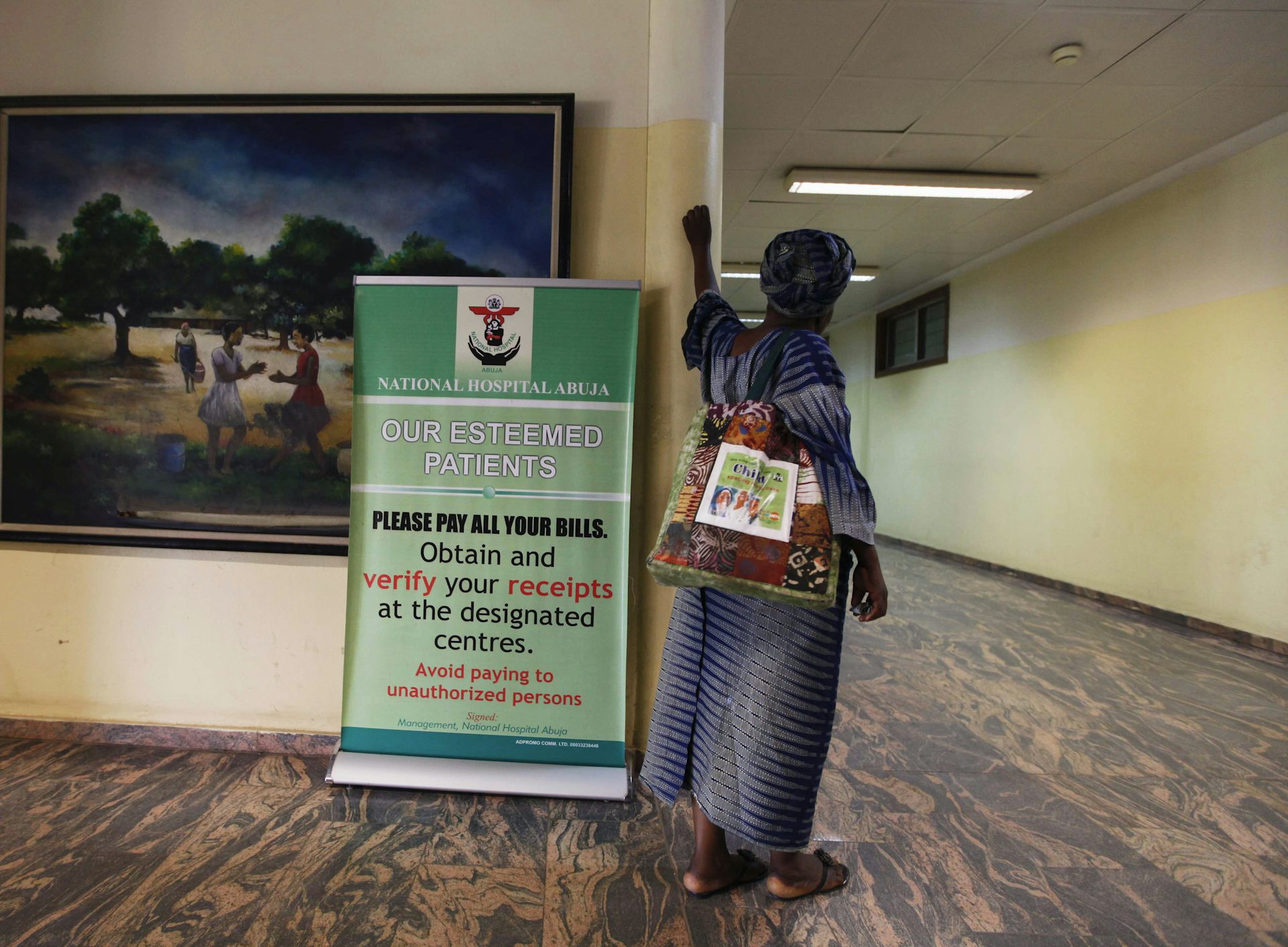 A woman looks down an empty corridor at the National Hospital Abuja, after staff members went on strike to demand for better employee welfare.